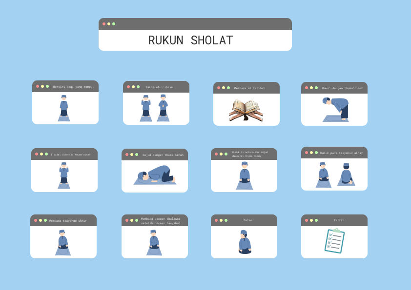 The pillars of prayer are the actions and readings that must be performed during prayer. If one of the pillars is left out, the prayer becomes invalid. These pillars include intention, takbiratul ihram, standing (for those who are able), reading Al-Fatihah, bowing, i’tidal, prostrating, sitting between two prostrations, final tasyahud, sitting tasyahud, and greetings.