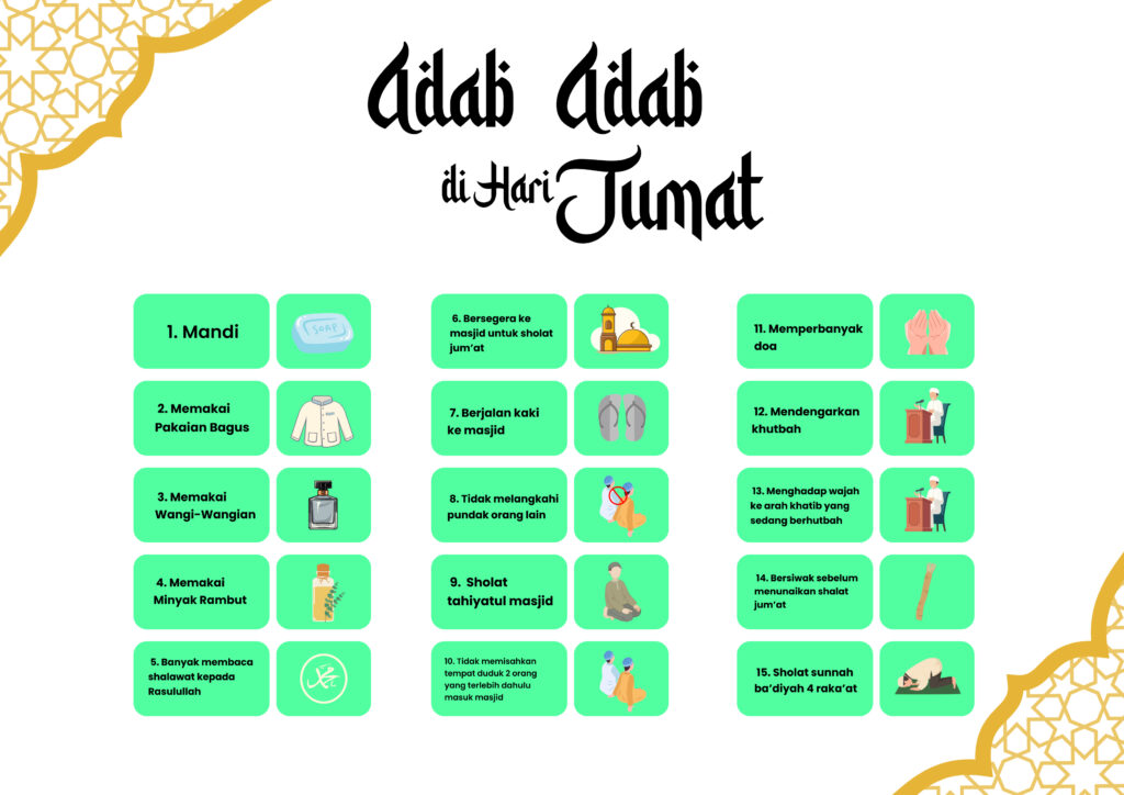 Friday etiquette is a procedure recommended in Islam to respect and honor Friday, which is a special day. This etiquette includes bathing on Friday, wearing the best clothes, reading Surah Al-Kahf, increasing prayers, coming early to the mosque, listening to the sermon solemnly, praying more, and maintaining cleanliness. The goal is to improve the quality of worship and get blessings on Friday.
